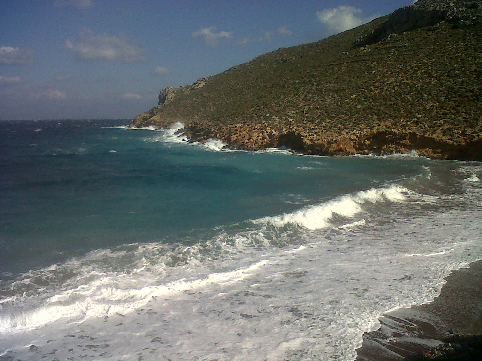 As Lisa and I walked down to Skafi today, the wind made my eyes water. It was fun to stand above the cove and feel the sea crashing powerfully into the rocks. Funny to think I’d had a long swim here on a calm, warm day just two weeks ago, in the first week of January. The wind will drop again soon and we’ll be swimming again, but for today it was good to see wild, surging, white-capped waves.