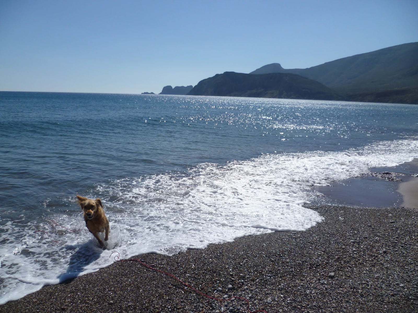 All ideas of dozing on the sand were pushed aside by the sight of the crystal-clear sea glinting invitingly over the colourful pebbles. It had to be done. I braced myself for the cold water, tried not to think about that first minute as I dove under to see the magical blue, then swam quickly until the sea felt good – the best moment – across the bay and back. As usual I started to feel the chill again on the way back, making me speed up my strokes and it was good to get out, although a breeze was moving little clouds across and blocking my sun. One of the best things about winter swimming is how invigorating it is, though: I was now full of energy and although I’d brought a book to read, I felt like a walk. I’d actually brought water and fruit, and a water bowl for Lisa.