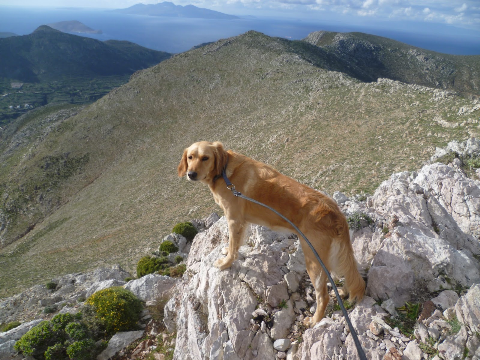 Lisa gets just as thrilled as I do by exploring a new walk, and she leaped over the thorniest thorn bushes with grace. I feel like John Noakes talking to Shep the dog on days like this (showing my age). In some places, we were able to walk along the old stone terraces; other times we pulled ourselves up and down rocks. Everywhere there were flowers – daisies, the purple blooms on the sage bushes, and endless tiny blue and yellow and purple and white-and-pink flowers. Lisa pulled towards a cliff where we had the caught the most amazing moment of silver rippling sea with clouds above Profitis Ilias. There was a threshing circle on a flattish col, then a tough scramble up a steep slope to the rocky summit again. For the first time, I got up close to a stone-built structure that from afar had looked like an empty windmill; up close, it wasn’t circular at all but a semi-circular tower with tiny windows on the sea in all directions, and steps up to the top.