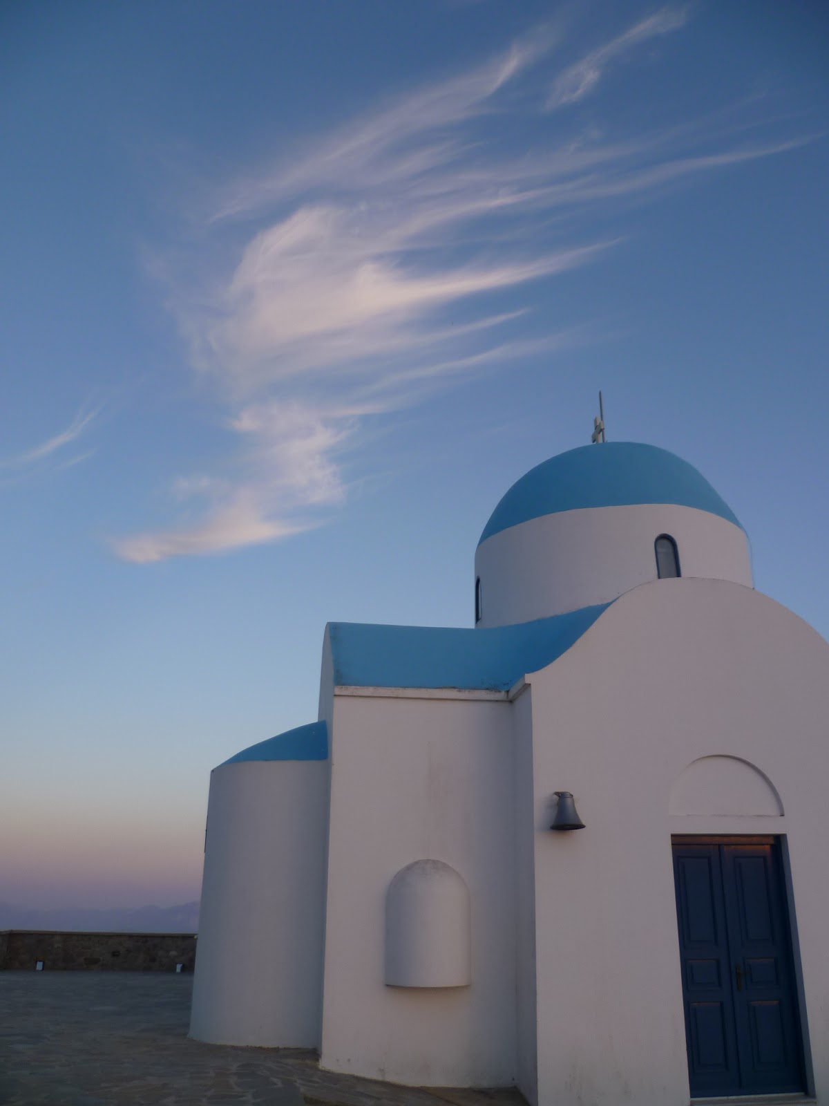 That evening, we walked to Ayios Andonis in the evening. I watched the beautiful golden sun set behind the island, then started walking to the harbour, and a red sliver of sun came into view again and I had a second chance to watch it set. Stopped for a drink and a chat by the sea, and when I got up to leave, a bank of fog was spreading over the island. After the intense heat of the day, it was delicious to walk home through damp cloud.