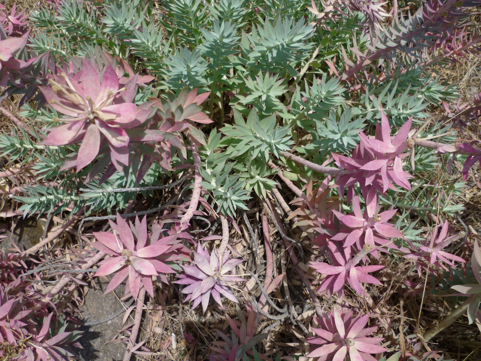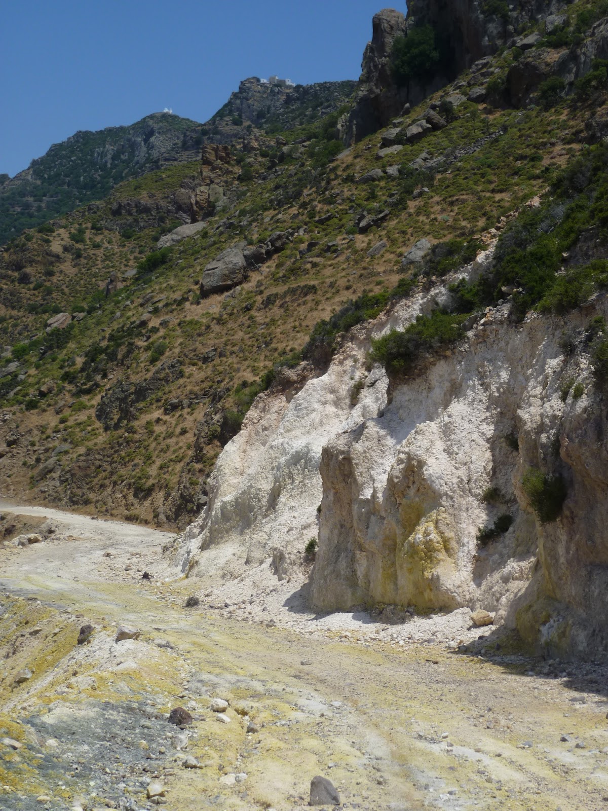 And so, the scooter bumped along ahead and I wandered slowly and happily along a track I’d explored before, looking at spiky plants with dusty-pink flowers, poking my nose into a chapel built into the rock. As he photographed an old tree, I walked up a slope and found the remains of a house with a threshing circle and cistern and vaulted stone rooms, overlooking the centre of the volcano. Further along, I visited the little monastery of Stavros, finally descending towards the volcanic craters, reaching a white and yellow point on the path where I caught for the first time the earthy sulphur smell from the fumaroles that always makes me feel close to something mysterious and deep.
