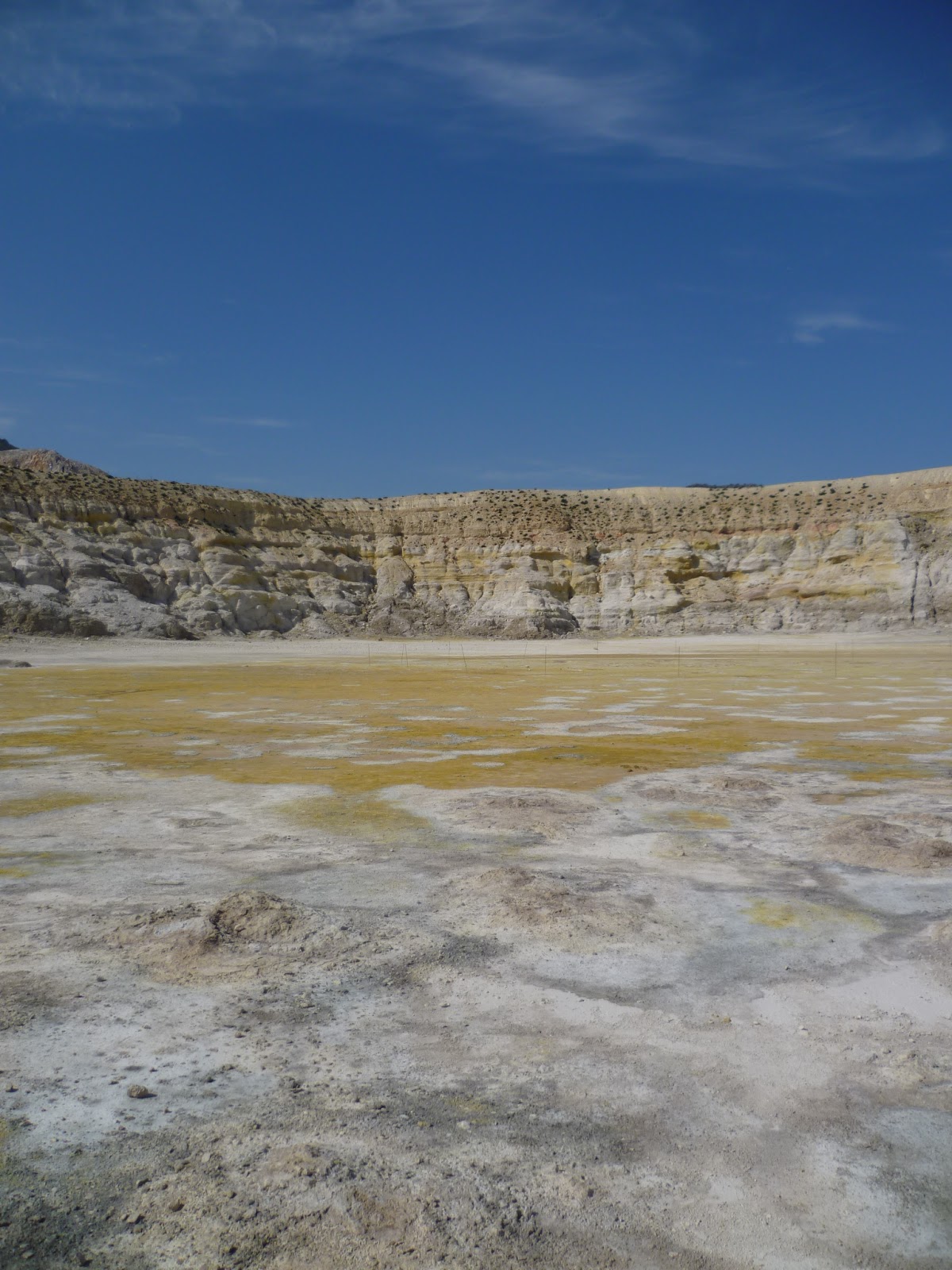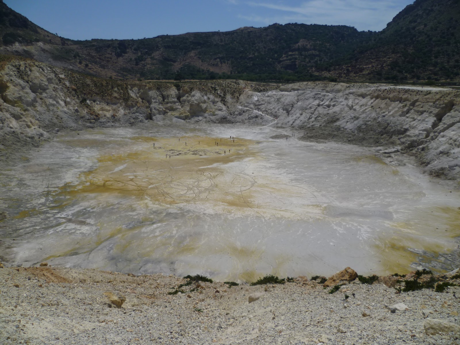 Veering off to one of the smaller craters, I spent half an hour just poking around another deserted farm with its stone walls and threshing circle. Yiannis wondered what had happened to me – there’s no phone signal within the caldera. I studied the shapes and the colours on a slope – tinges of green and orange and pink – as the wind caught the rising steam. The centre of the volcano felt peaceful and otherworldly. Because it’s a unique place, though, coachloads of daytrippers can present a bit of a problem. Suddenly I heard a noise and spotted not one but two – no, three – coaches coming down the road in the distance. People would be here soon.Stephanos crater is a vast white sunken circle streaked with yellow and grey, with steep walls and a flat, cracked mud floor punctuated by a cluster of blow-holes. Around the edges of the crater, bright yellow openings release hot vapour, rising in wisps as if to inspire the oracle. I knelt close to listen to the hissing and gurgling within, and was momentarily blinded by the steam on my sunglasses.