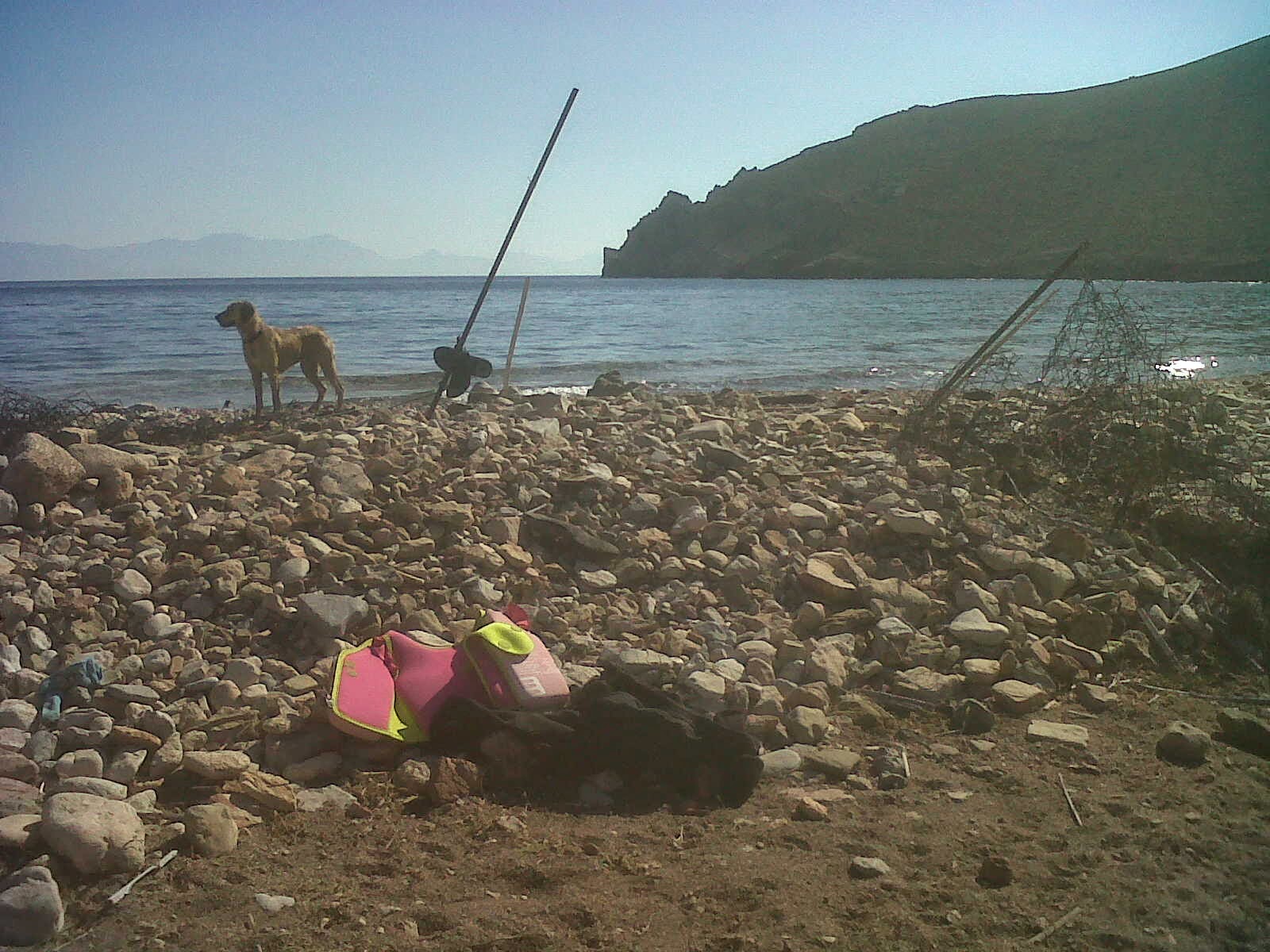All sorts of things wash up on Skafi; visitors make shelters out of driftwood and artworks out of old shoes, and clothes are sometimes hung across the cave at the far end to scare the goats away when the farmer, Menelaus, doesn’t want them drinking seawater. The lifejackets were odd, though. They seemed expensive and new, and I wondered if they’d inadvertently been lost from a charter yacht. This is the season for yachts to be mishandled by holidaymakers, and in fact during these days at the start of July, one was just about to enter the harbour at Livadia in an ill-advised way during a storm, and sink Nikos the fisherman’s little varka.Closer inspection revealed the floatation devices were different sizes, including a few for small children. Alongside were items of clothing. Hours later we learned there’d been a new arrival of Syrian refugees, and I guessed they must have arrived at Skafi.