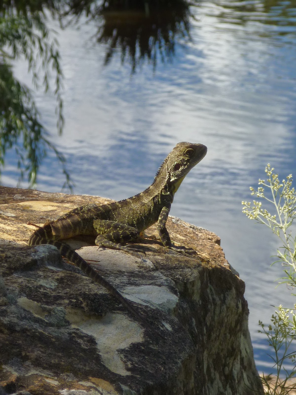 These were over a foot long, pale green-grey with ridged backs and black stripes across their tails. They kept their eyes glued on me for the ten minutes or so that I watched them then reached slowly in my bag for my camera. I later learned that they were water dragons, native to eastern Australia, and they must have got used to people as the trail was close to the village. I’d only continued a few more steps when I heard a splash in the river below and saw something swimming like a wiggling arrow across the surface, before pulling itself up on the rocks. Sure enough, another water dragon.