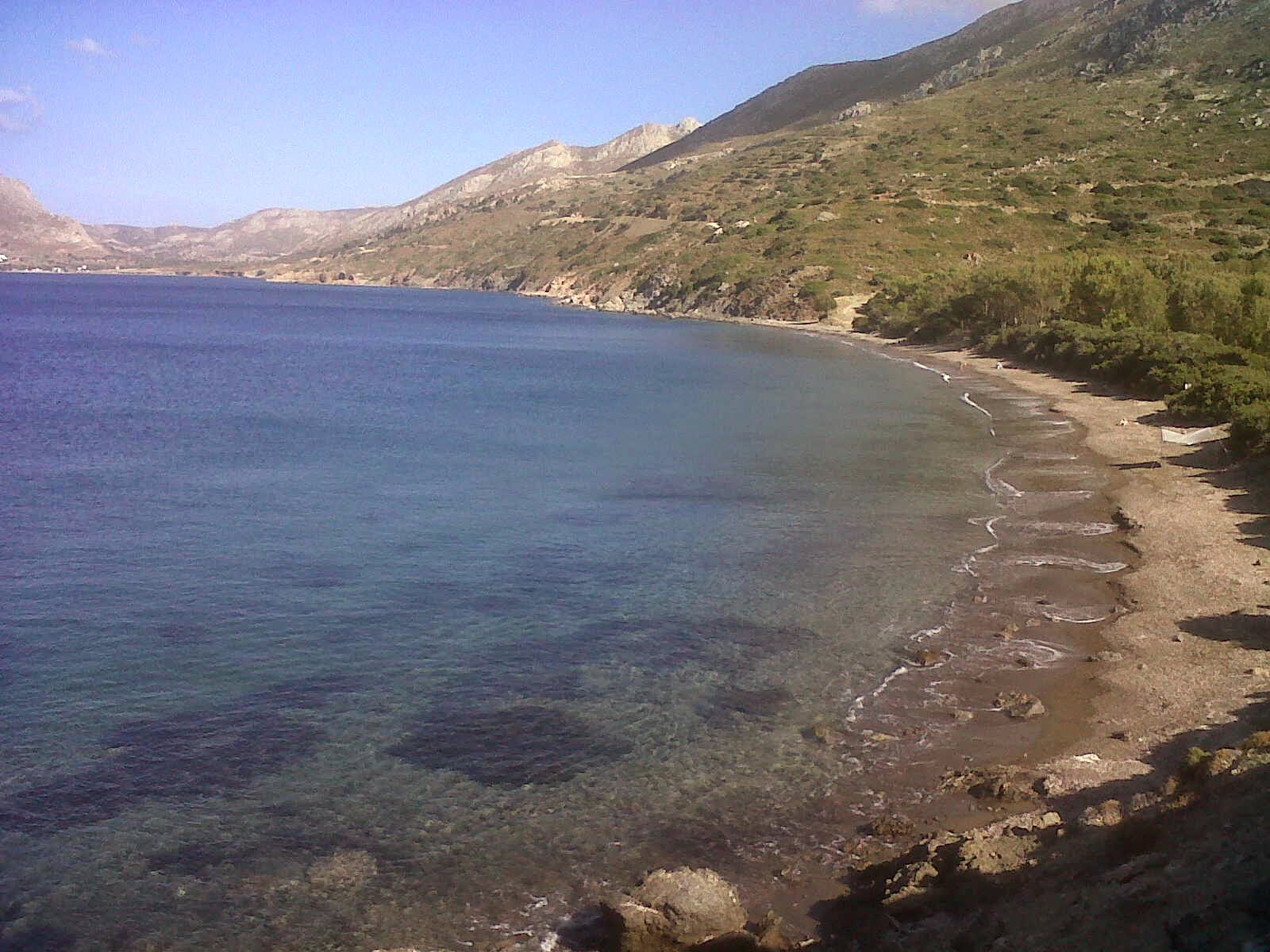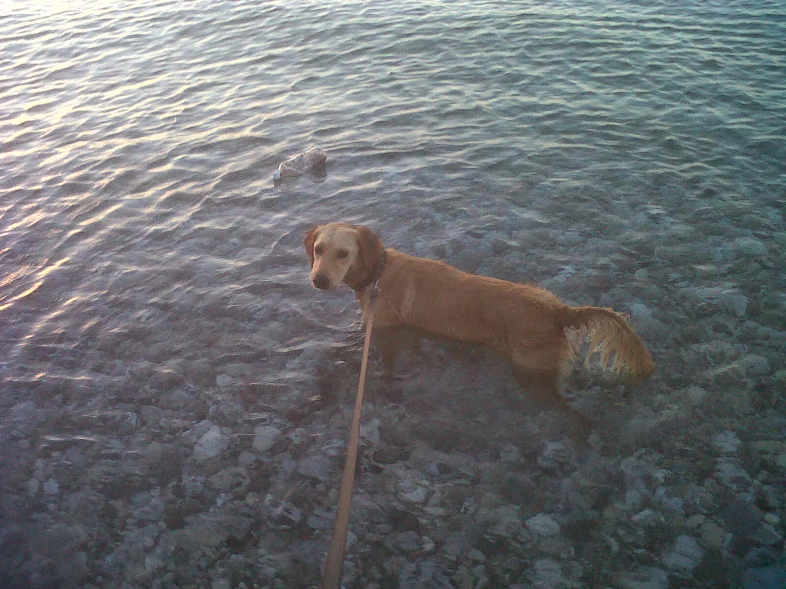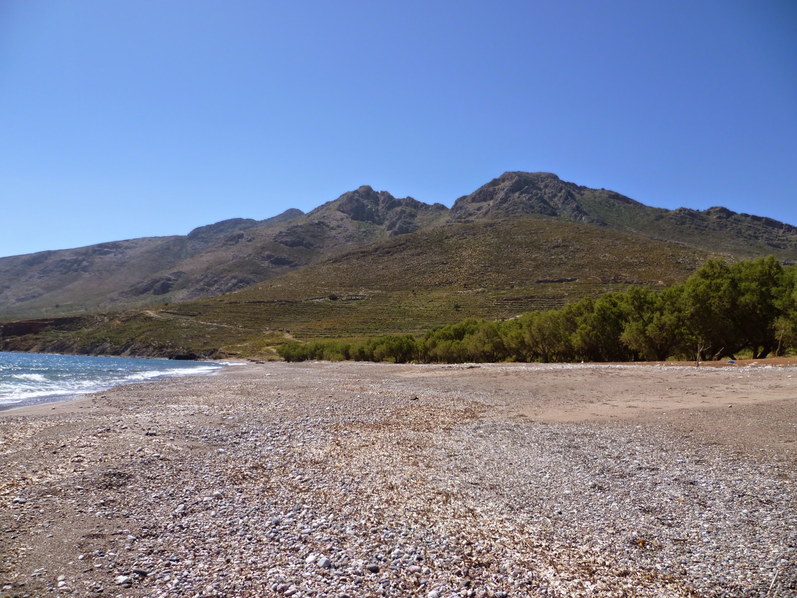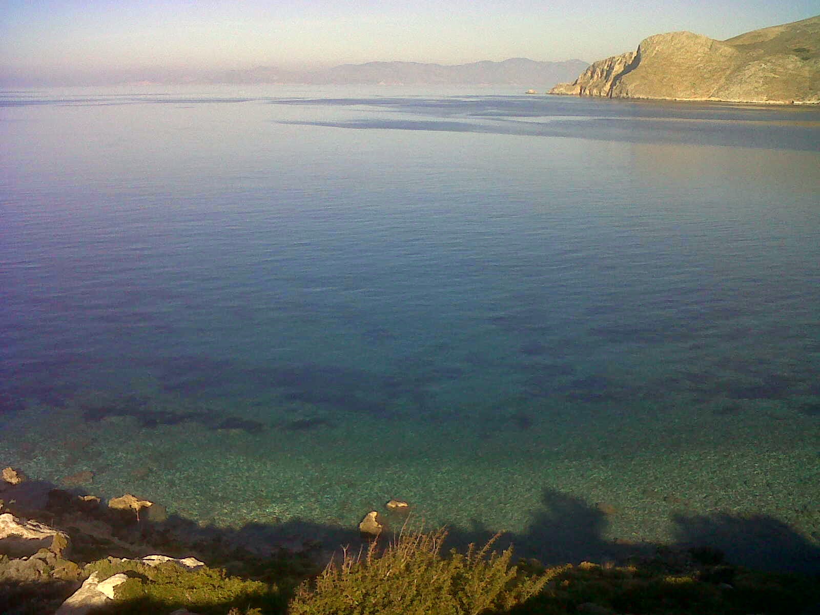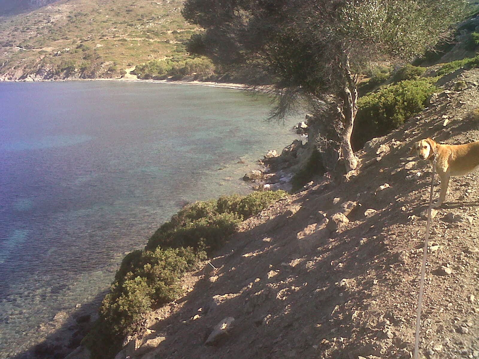 When Lisa and I reached the top of the track that leads down to Plaka beach, the sea looked clear and blue and perfect. I let her off the lead so she could run to the sea to cool off.