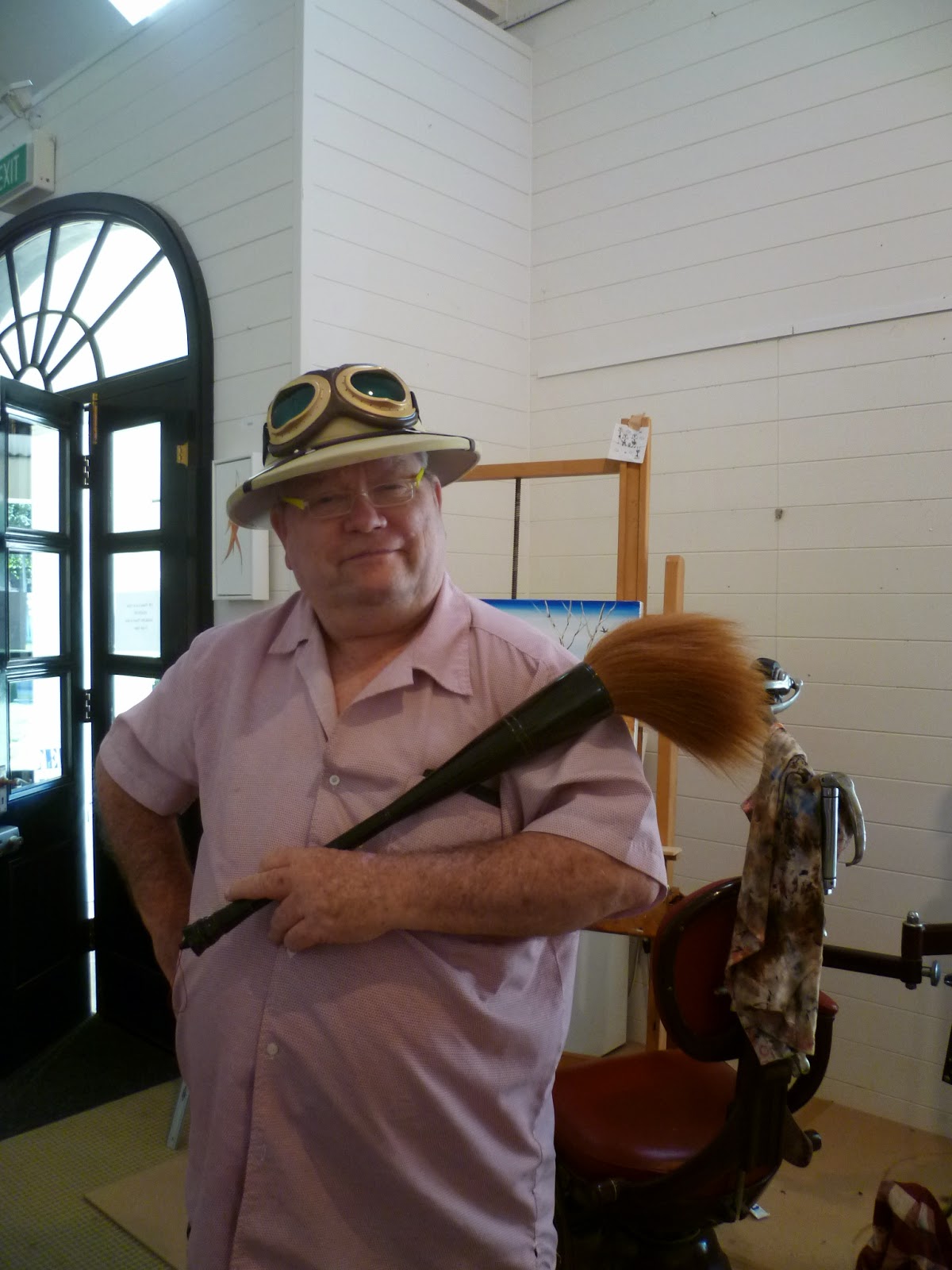 I was making my way around the park after my water dragon encounter, past the old bank and bakery (above), when I saw an ‘artist’s studio’. Through the open door I glimpsed what appeared to be a VW beetle painted with emus… I poked my head inside and was encouraged to come and look around. And thus I had my unforgettable encounter with artist Peter Browne. The paintings that covered the walls transported me out of leafy green Berrima - with its willows overhanging the lazy river - and into an outback Australia of searing heat, bare skinny gum trees and scrubland, with wooden shacks, lanky farmers, lankier horses and curious animals. The details made me laugh aloud, especially when I saw one called ‘Early Boat People’ showing a first encounter between Aboriginals and strangely dressed colonials clutching those rabbits that would go on to wreak such havoc.