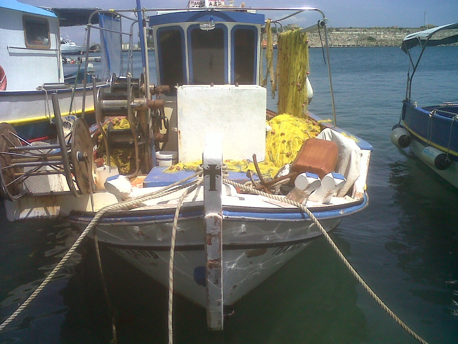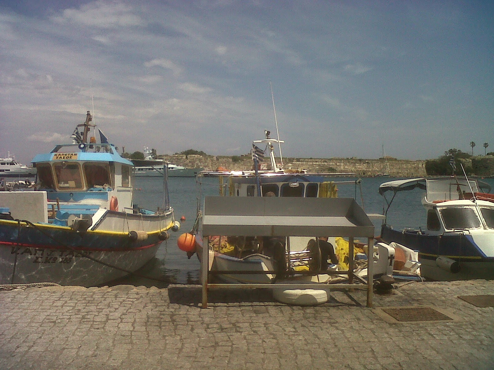 After my coffee, I didn’t have to wander far to find a bakery with a good cheese pie, and next door was a ticket office where I bought my ticket to Tilos for tomorrow, while at the café-bar opposite, groups of young people sat around sipping coffees, enjoying the sunshine. I walked back to the harbour and watched the fishing boats with their blue trim and hand-painted names: Kapetan Tasos, Giorgos, Maria. A wiry old man a with deeply tanned, lined face, wearing rubber boots and old clothes, was telling his young helper to leave his work mending nets on the boat with the cross painted on its prow, the Panayia Kastrou, Our Lady of the Castle. Ela! As to… Many of the boats had dark blue circular talismans against the evil eye. Another young man was threading bait onto hooks, listening to music. ‘Eh Yiorgo, ti ora eineh?’ he shouted at a man who was strolling from one boat to another. An old man put a cigarette in his mouth, tossed the cellophane from the new pack over his shoulder into the water. He stood to talk to Yiorgo, gestured with his arm outstretched and his thumb and forefinger twisted in a question, lamented the state of affairs compared to the old days when he would make such-and-such ‘kathara’, take-home. Then he sat again with a mobile phone to his ear.