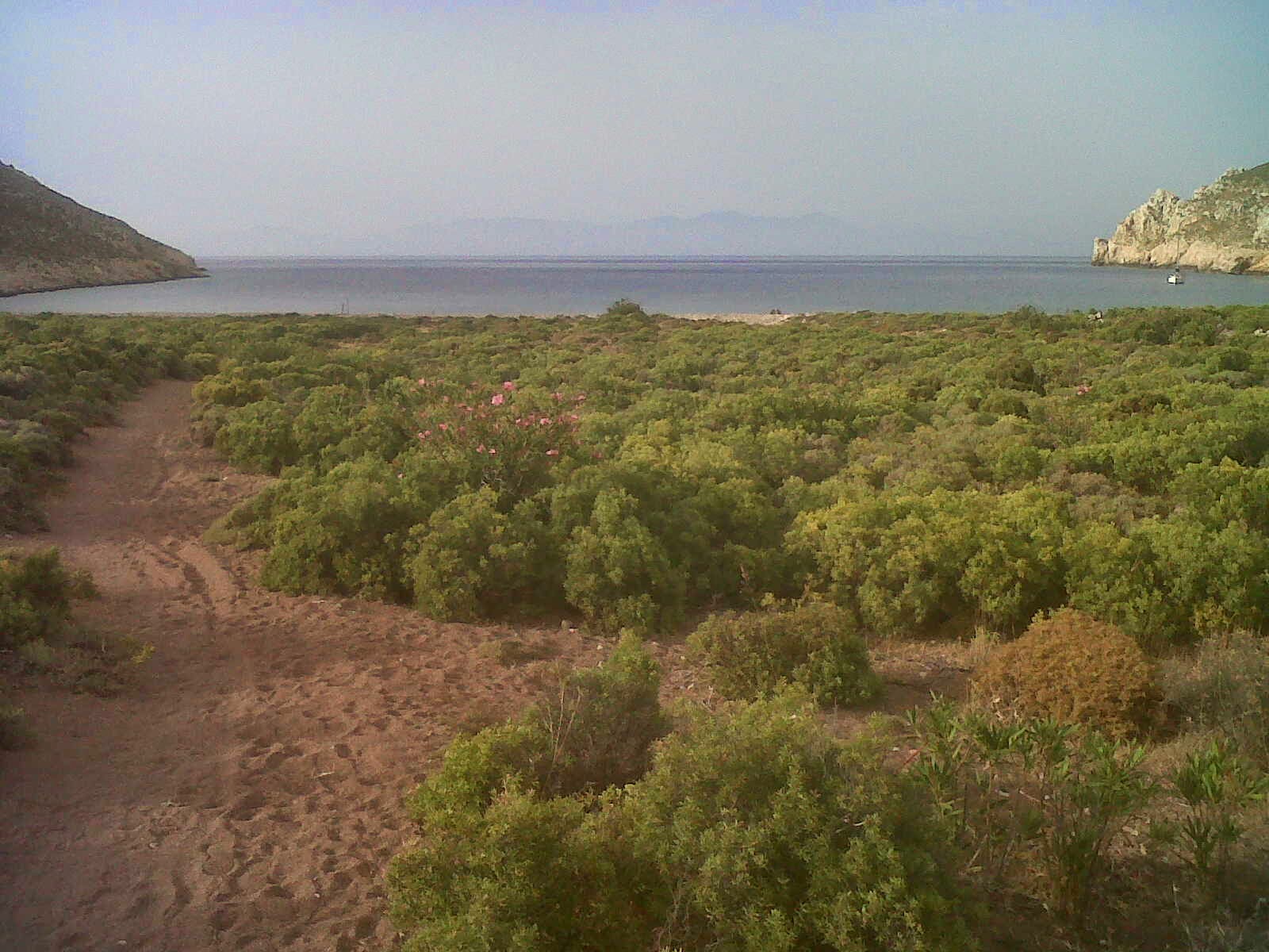 Everything was packed and organised. Plaka was where I'd decided to spend 12 July, my last day in Tilos for months. I set out with Lisa in late morning. Walking by Elpida, the taverna by the sea where the road turns one way to Ayios Andonis, the other to Plaka, on impulse I stopped and bought dolmades se paketoto take to the beach for lunch. The clouds that had kept the day cool seemed to be clearing, and I might want to linger by the sea.
