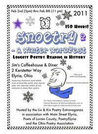 I will be visiting the town of Elyria, Ohio, just west of Cleveland, on Thursday, February 3'rd to participate in Snoetry 2, a 150 hour attempt to set a new record for the longest poetry reading ever.