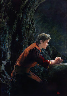 This painting represents a great many "firsts" for me--today was the first time I ever painted a set-in sleeve--at least where the shoulder sleeve is visible. Small tucks and gathers are new (but exciting) terrain. Spent a great deal of time doing what I call "watching" my painting: close observation, trying to absorb what is good and what needs work. I've decided to forgo any pattern on Mary's dress, as I believe any pattern would be visually visceral. . . I've never painted a fabric which reflects so many colors!