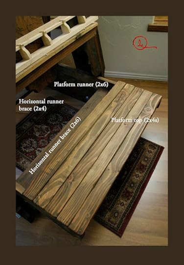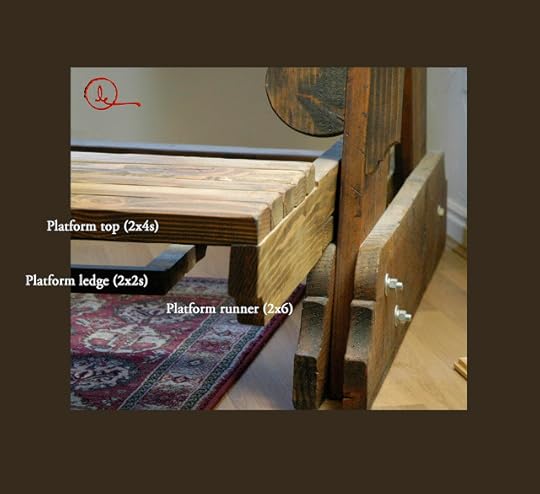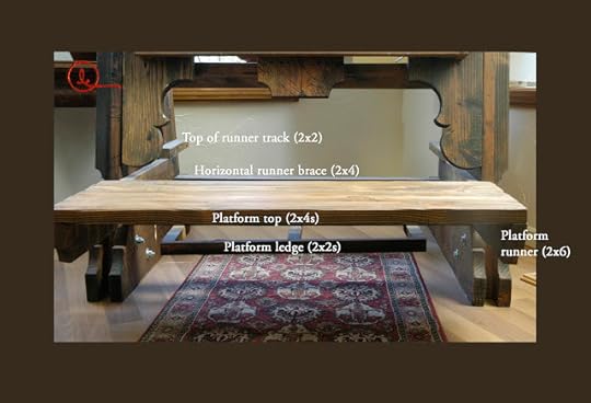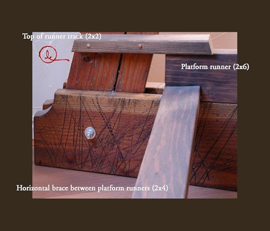 The next photograph shows the extended platform from the top. The "horizontal runner brace (2x4) is the back of the platform. The "horizontal runner brace (2x6) near the middle of the platform is the cross-member to which the "platform ledge" is attached.