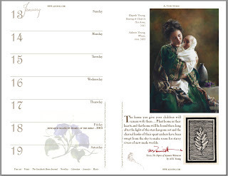 Printed on heavy paper, the book is bound with black plastic spiral and rests flat when open.Each week in the calendar is accompanied by the kind of artwork and writing appearing in the sample pages, at right.