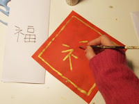 2. Turn your paper so it makes a diamond shape, not a square. Copying the character found HERE, paint the Chinese word for luck (FU) in the center.
