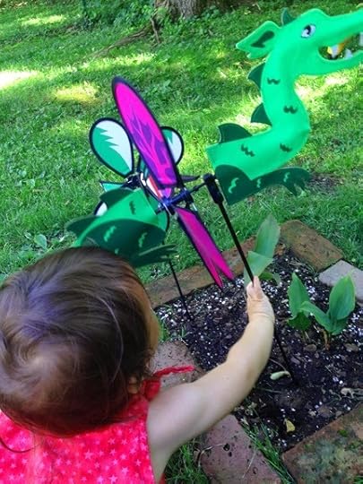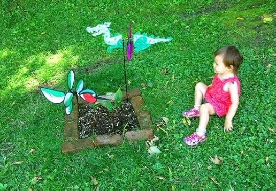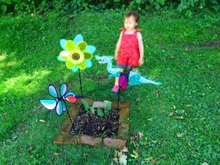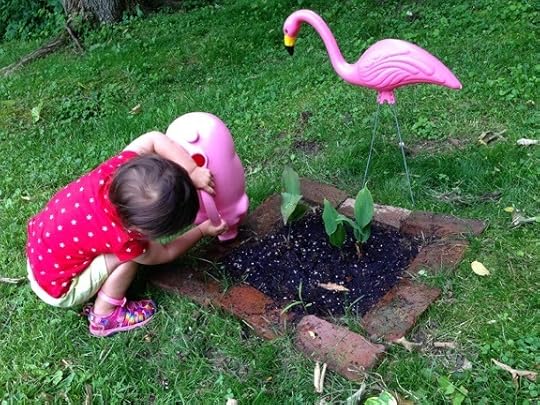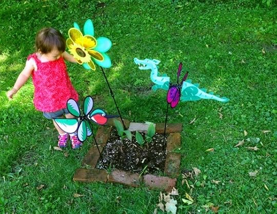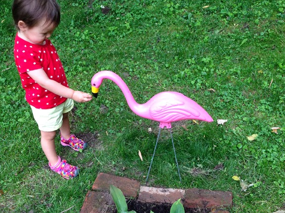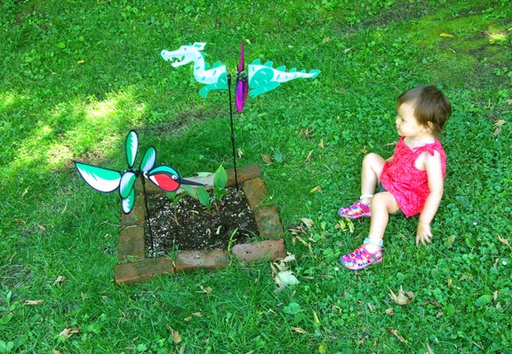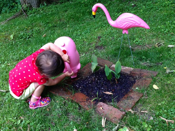 The pink flamingo watching over Rain Dragon's garden was deemed not-child-friendly as she kept trying to pull it up from its metal legs. To make up for its disappearance (and to her great joy), we got her some new garden ornaments: