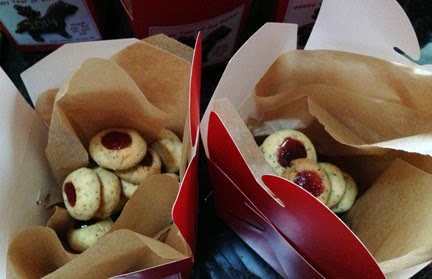 And just in case candied citrus peels weren't everyone's cup of tea, I we made some lucky red thumbprint cookies to send along: