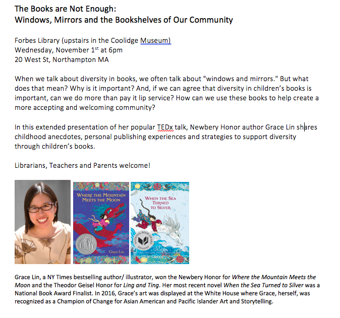 20 West St, Northampton MAWhen we talk about diversity in books, we often talk about "windows and mirrors." But what does that mean? Why is it important? And, if we can agree that diversity in children’s books is important, can we do more than pay it lip service? How can we use these books to help create a more accepting and welcoming community?In this extended presentation of her popular TEDx talk, Newbery Honor author Grace Lin shares childhood anecdotes, personal publishing experiences and strategies to support diversity through children’s books. Librarians, Teachers and Parents welcome!