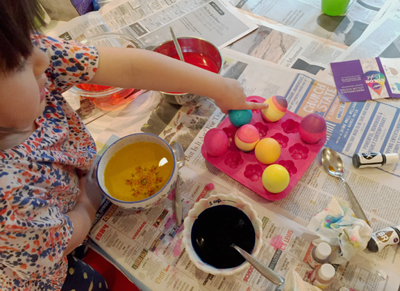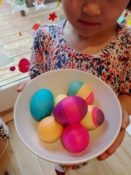 But this year, Rain Dragon wanted to color "really bright" eggs, so I decided to follow internet directions as close to the letter as possible. Cool the eggs in ice water! 20 drops of food coloring! Well, I am happy to report that, for once, the internet told the truth. Our eggs were the most colorful I've ever made them: