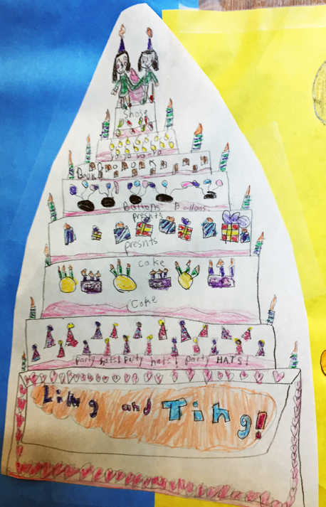 Most of the younger grades chose from Ling & Ting books. Ling and Ting Share a Birthday was particularly popular; I think the last story about the underwear as birthday gift was what did it. This class illustrated every story on their door: