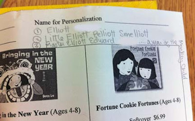 It says to sign books to 1. Elliot 2. Little Elliot Pelliot Smelliot 3. Master Elliot Edward...a year of the Monkey Child