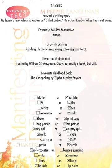 This week, M Pepper Langlinais shares bits and bites on writing, including a glimpse of her recent YA release, Manifesting Destiny, the first in a new series for Evernight Teen Publishing. Be sure to drop over to her blog and check out all of her books. The winner of the GIVEAWAY will get to choose which book they'd like to read. You'll find the entry form at the end of the interview.