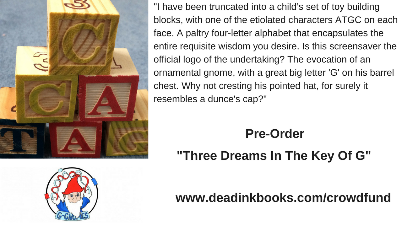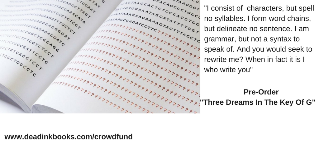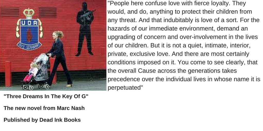 In October my new novel will be published by Dead Ink Books. "Three Dreams In The Key Of G" tackles many large themes, from parenting and child development, through "Nature" versus "Nurture", sectarian politics to what it means to be human. Part parenting guide, part mother's journal of despair, the book is full of bitter humour (some extracts can be found here).Stylistically the book is quite daring as well, with visuals, two different sized alphabets (our 26 letter and DNA's 4 letter alphabet), as the book drills down beneath the level of word to that of the letters themselves).