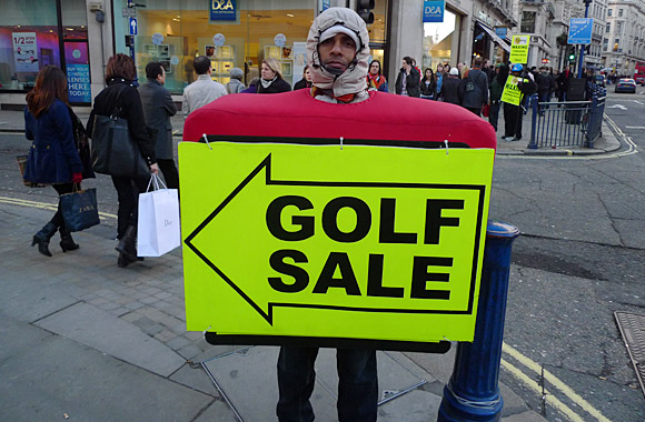 Bulbous and blockish. Dimpled gutty covering the gut spread of the host, paint wash pointed directionality. The man’s encumbrance further augmented by a hand-held placard proclaiming a ‘Golf Sale’. But the urban gallery he was playing to were giving him the bird(ie) as they dodged and weaved his bunkered down sand-trap. The cardboard rondure was more millstone round his neck than albatross. Weary of dropped shots and shouts of "fore!", the caddie decided his location was shanked and conceded the hole.