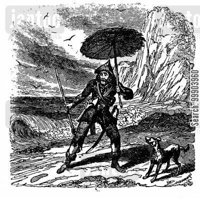Subsequent illustrations of the episode have reflected a change in the way different generations of readers have approached it – Crusoe is no longer depicted as terrified, only curious, sometimes on bended knee like an explorer or tracker, examining the evidence more closely before deciding what to do. And modern editions of the story as presented to young readers seem to emphasize the humanity of the moment. Crusoe is lonely, longing for a friend, and Friday will become one. We no longer see images of the scene where Crusoe places his foot on the neck of the kneeling Friday, signifying the Englishman’s mastery over the black man whose footprint had frightened him.
