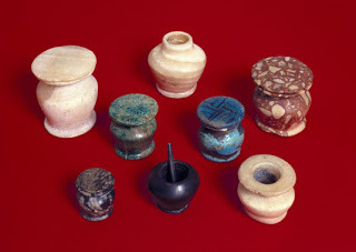Once the lady of the house had on her protective kohl, she might then decide to use red ochre on her lips or dab her wrists and breasts with perfume. Having completed all of this, the lady would then dress for the occasion.