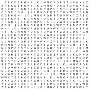 Book ciphers continued to develop over time and eventually led to the creation of what is considered the only unbreakable cipher. The running key cipher, which is the only method of concealment that has withstood cryptanalysts’ efforts, is constructed by using the book as the key text. In this case, the individual letters in the text are used as the key and avoid repetition. For example, if you were to use Singh’s The Code Book as your key, then you would begin to encrypt the plain text “meet at dawn” using the first line, “On the morning of…”. The first letter of the key is ‘O’ and so we would go to the row that starts with ‘O’ in the square drawn below and encrypt ‘M’ as ‘A’, and so on. The security of the running key cipher lies in its continuity- that is that the key does not repeat itself. The key is simply comprised of the words of the novel, which do not have a recurring patter. In this way, the running key cipher can withstand all the conventional methods of cryptanalysis.
