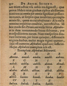 If a message contained only strings of a’s and b’s, it would be quite obvious to a cryptologist that some sort of cipher was used. Francis Bacon’s genius lies not in this simple substitution cipher, but in the fact that his cipher could be wielded to make, in Bacon’s own words, “anything mean anything” (Sherman, 2010). With the extra twist of steganography, which is concealing messages through deception, a-form and b-form can be two types of anything, from black and white to plus and minus, not just text (Sherman, 2010).