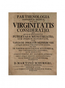 The high point of belief in such bleeding was Martin Schurig's Parthenologia historico-medica (1729), which brought together a huge range of cases from the sixteenth and seventeenth centuries to include menstruation through the ears, skin, gums, saliva glands, tear ducts, the crown of the head, fingers, feet, the stomach and lungs, the bladder, the bowels, the back, the navel, and even a cut on the hand, because 'Nature searches for an exit route for the menstrual blood'. Physicians noted that the first reaction of a physician when confronted with 'a delicate female' suffering from such bleeding may be 'alarm and anxiety'. What about the reactions of the patients, I wonder?