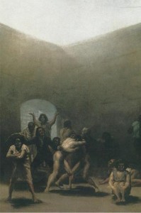 Completed by Spanish artist Francisco Goya in 1794, Yard with Lunatics consummately portrays the situation in the above decree. Following an episode of personal mental and physical breakdown, Goya created a set of works he called caprichos, images displaying Spanish cultural spectacles (e.g. bullfights), which he sent to the Royal Academy of Arts of San Fernando.4 The Royal Academicians referred to this series as "various scenes of national diversions." In a rather dark twist, however, Goya followed by sending the Royal Academy Yard with Lunatics as a conclusion to the caprichos. Goya's letters to Bernardo Iriarte, Vice-protector of the Royal Academy during that time, capture how The Yard with Lunatics is dually representational of Goya's inner torment and the outward treatment of the mad during the late eighteenth century.3