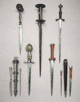 Chi scrive libri storici deve avere almeno una piccola infarinatura di armi. Chiariamo innanzi tutto perché vengono chiamate armi bianche. Esistono due teorie: una indica come motivo il fatto che le lame scintillano alla luce del sole e assumono un colore bianco, l’altra la differenza con il colore quasi nero della polvere da sparo.Bianche o meno, tagliano e la loro origine va collocata a cavallo dell’anno mille, epoca in cui la produzione dell'acciaio (massa ferrosa, carbone e aria), cominciò ad avere un certo sviluppo. L’acciaio ottenuto, ricco di ossido e scorie, veniva temprato con il sistema della martellatura e del riscaldamento e non è escluso che già i romani conoscessero questa tecnica, poi dimenticata con la caduta dell’Impero. Uomo primitivo a parte, gran parte dei sistemi di combattimento con la spada dell’alto medioevo risalgono agli usi delle tribù germaniche che invasero l’Europa. A partire dal V secolo d.C. Goti, Longobardi, Franchi, essendo abili nel maneggio di lunghe spade da usarsi in coppia con lo scudo, diffusero anche in Europa l’uso del duello come sistema per dirimere le questioni d’onore o invocare il giudizio di Dio, come raccontavo in un articolo sui duelli di qualche tempo fa.