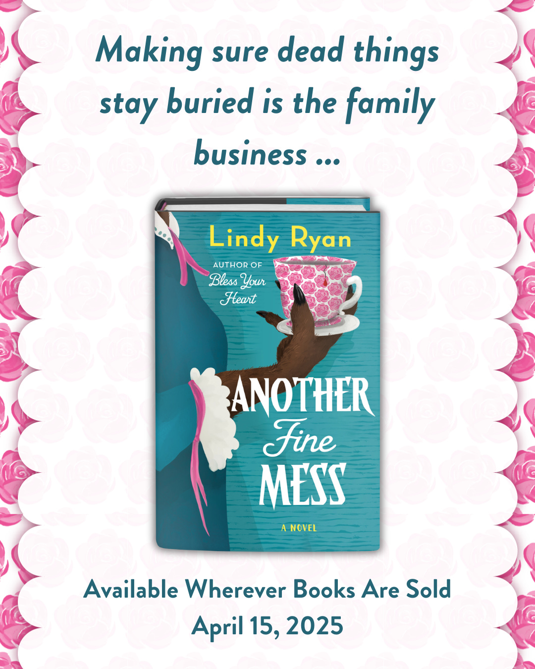 April is a little extra exciting for me this spring, because not only are the Evans women celebrating their first full year out in the world since the release of BLESS YOUR HEART (which is now available in paperback) tomorrow, but they’re back next week with a brand new problem to deal with in ANOTHER FINE MESS. This next heart-warmingly grisly adventure picks up right where we left off: as Lenore and Luna welcome their first full moon since that God Awful Mess repeat, right on the funeral parlor lawn four weeks ago.