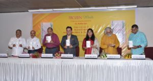 Guests at the launch of a collection of poems – Frozen Words. Seen in the picture (from L to R) Mr. Shakunt Apte, father of the author; Prof. Dr. Nigam Dave, Director – SLS, PDPU, Gandhinagar, Dr. Jay Narayan Vyas, Economist & thinker; Mr. Amish Tripathi, Mythological Fictionnist & Best Selling Author; Ms. Shalaka Apte; Kavi Shri Tushar Shukla & Mr. Shyam Parekh, Festval Director – Gujarat Literature Festival