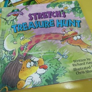 Stretch’s Treasure Hunt is an amazing Story of Animal Friends who face the storm and help each other to hide in a cave – all after they left Noah’s Ark ! Later when they came out, it was Mess all over ! The Strech Giraffe saw a nose rock and mentioned of old Treasure buried nearby…all animals in their excitement made a mess of nature, uprooted trees and made all mess. They started fighting and threw coconuts and mud at each other.