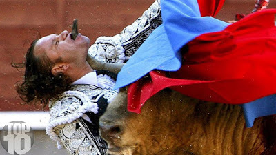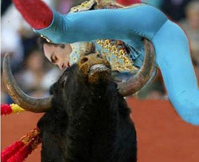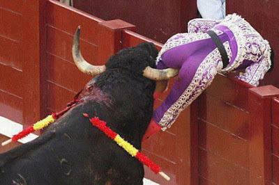 "...the material energy was accepted by the Supreme Personality of Godhead in order that He might exhibit pastimes for the living entities who wanted to enjoy and lord it over the material energy. This world was created through the material energy of the Lord for the so-called enjoyment of such living entities. Why this material world was created for the sufferings of the conditioned souls is a very intricate question. There is a hint in the previous verse in the word lilaya, which means "for the pastimes of the Lord." The Lord wants to rectify the enjoying temperament of the conditioned souls. It is stated in Bhagavad-gita that no one is the enjoyer but the Supreme Personality of Godhead. This material energy is created, therefore, for anyone who pretends to enjoy. An example can be cited here that there is no necessity for the government's creation of a separate police department, but because it is a fact that some of the citizens will not accept the state laws, a department to deal with criminals is necessary. There is no necessity, but at the same time there is a necessity. Similarly, there was no necessity to create this material world for the sufferings of the conditioned souls, but at the same time there are certain living entities, known as nitya-baddha, who are eternally conditioned. We say that they have been conditioned from time immemorial because no one can trace out when the living entity, the part and parcel of the Supreme Lord, became rebellious against the supremacy of the Lord."What these idiotic matadors fail to understand is that for all their machismo in fighting off the charges of a weakened bull, they must ultimately suffer karmic reaction - or "bad karma," and sometimes it ain't pretty.