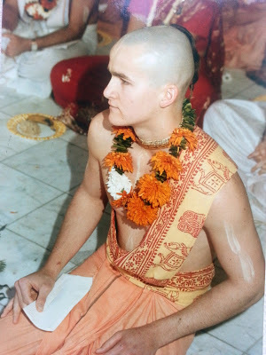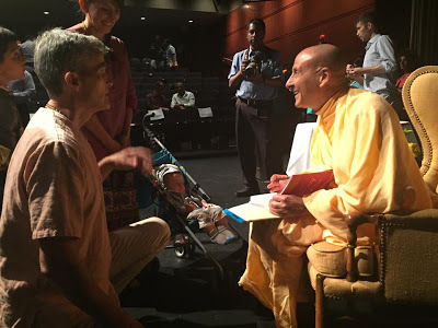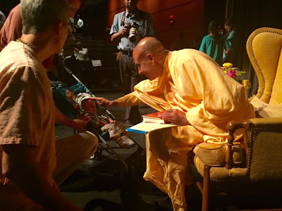 Soon it was our turn. I offered my respects by bowing my head to the ground in the traditional manner and reciting a prayer of respect to all Vaisnavas. At first, Maharaja did not seem to recognize me. I handed him my book for signing and then the boy with the notepad showed him our names. Maharaja glanced at our names, but still did not make a connection. Knowing Maharaja would not have much time to chat, I immediately introduced my wife and son and asked him to please bless Bhimal and if he would kindly do the grain giving ceremony for the child next week. He immediately agreed and leaned over to touch the boy's head. He then looked at me again and his eyes lit up. His pupils dilated like they were taking in the universe and with a broad smile, he communicated clearly that he remembered me. We touched hands and then he leaned over to hug me. I did not feel worthy, but gladly complied as we embraced for a good 5 seconds. Maharaja buried his face in my shoulder and I felt so much gratitude. He asked where I was living and I told him we now live in Colombia at my wife's animal sanctuary.