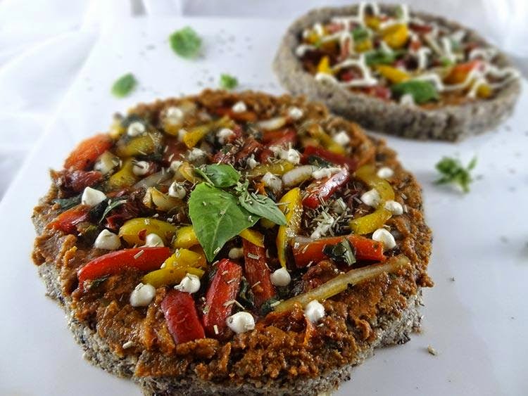 Blitz Nuts and Seeds in food processor until meal consistency achieved.Add remaining ingredients and blend until well mixed.Form 4 personal pizza sized crust on teflex dehydrator sheets. I find that using my hands and a spoon for the lip of the crust works best.Dehydrate at 115 Fahrenheit for 8-10 hours.Remove from teflex, put on mesh sheet and dehydrate for another 4-8 hours. The crust should be solid, firm and a bit chewy, or pliable in the hands.Marinara Sauce