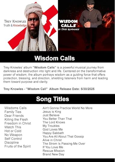 Trey Knowles' album "Wisdom Calls" is a powerful musical journey from darkness and destruction into light and life. Centered on the transformative power of wisdom, the album portrays wisdom as a guiding force that offers protection, blessing, and direction, shielding listeners from harm and leading them toward purpose and clarity.