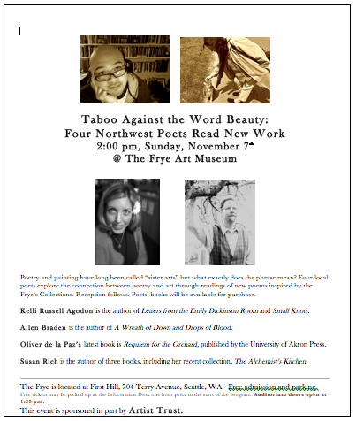 Oliver de la Paz, Susan Rich, Allen Braden and I are reading at the Frye Art Museum on Sunday, November 7th at 2 pm if you'd like to join us!