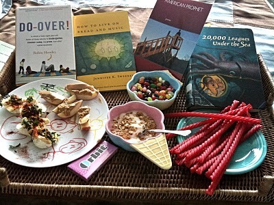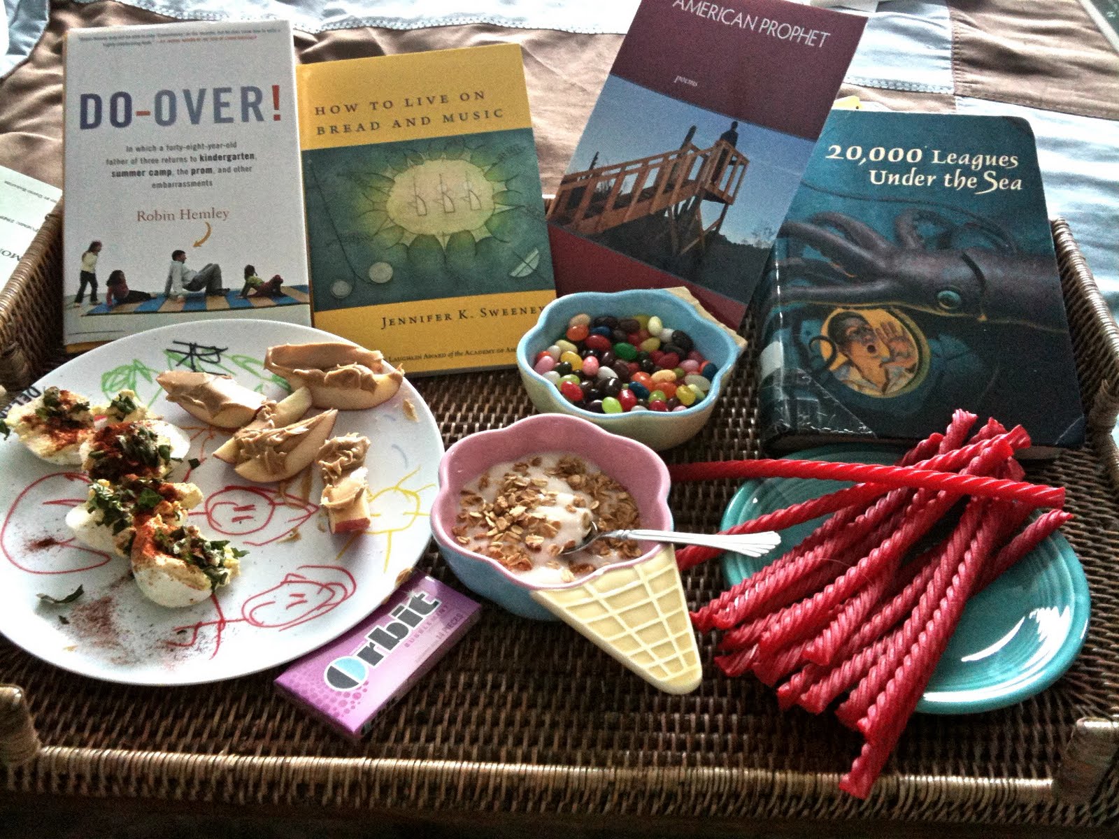Snacks include: Deviled eggs, sugarless gum, Jelly Bellies, red vines, yogurt with granola, apples with peanut butterMy daughter and I do this every so often and it's become one of my favorite (and hers!) thing to do and a great way to spend time with her.