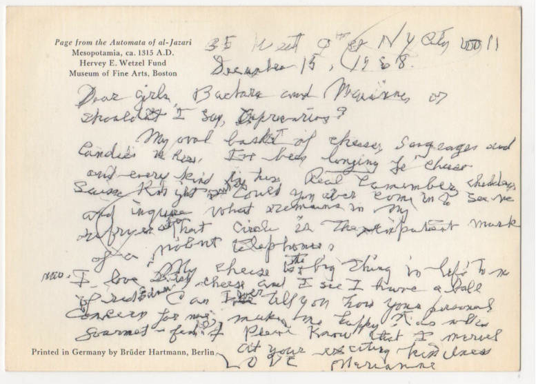 Marianne Moore Letter: Dear girls, Barbara and Marianne, or shouldn't I say, Impresarios[?]?"), written in an extremely shaky hand, apparently thanking them for a gift basket, reading in part: "My oval basket of cheeses . . . is here. I've been longing for cheese and every kind is here. Real Camembert. . . . Could you ever come in to see me and inquire what remains in my refrigerator[?]. That circle is the impatient mark of a [illegible word] telephone. My cheese is the big thing in life to me now. I love Dutch cheese and I see I have a ball of red Edam. Can I ever tell you how your personal concern for me makes me happy?. . . . Please know that I marvel at your exciting kindness. . . ." A bargain at $250 OR best offer.