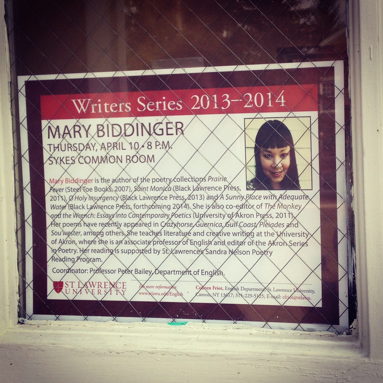 Had a blast reading at Saint Lawrence University in Canton, NY, though bittersweet because it was the last stop on my O Holy Insurgency reading tour. I felt so lucky to have beautiful weather and to get a good walk in, as well as a bit of sightseeing before chilling with the super smart students and faculty and having a really memorable night.