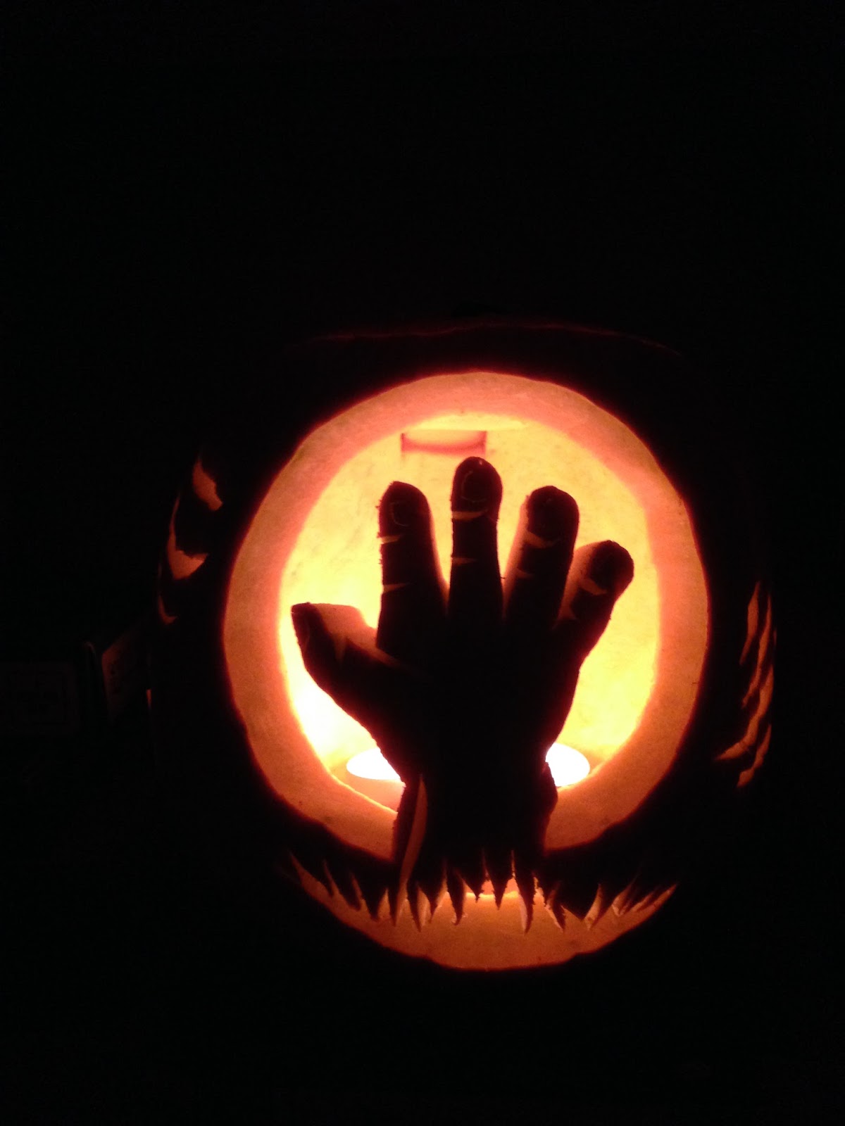 Of course, I came dressed as a ZA survivor.James, my incredibly talented fiancé, carved me some amazing pumpkins which will be displayed proudly in our window tonight. He never ceases to amaze me. Anything can become art when he's around.