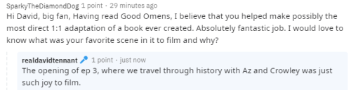 Q: Hi David, big fan, Having read Good Omens, I believe that you helped make possibly the most direct 1:1 adaptation of a book ever created. Absolutely fantastic job. I would love to know what was your favorite scene in it to film and why?