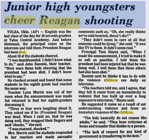 I was in my senior high school English class when the principal announced this news on the school PA system. Our teacher started crying, and the nine of us students cheered. Our teacher said that she was horrified by our lack of respect for Reagan. One of the other students replied that we were horrified by Reagan’s lack of respect for anyone other than his rich white friends. She never forgave us for it.