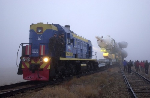 ROCKET TRAIN – On a foggy day, a train transports a Soyuz rocket to the launch pad at the Baikonur Cosmodrome in Kazakhstan, October 29, 2000.