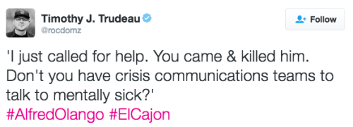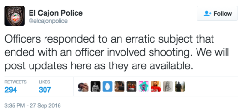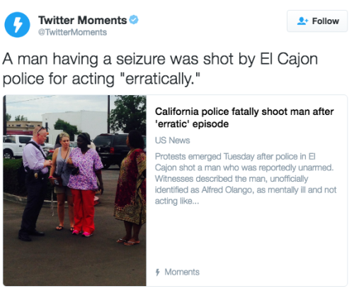 El Cajon police kill 30-year-old black man Alfred OlangoPolice in El Cajon, California, fatally shot 30-year-old black man Alfred Olango who some witnesses said was unarmed, had mental disabilities, and had his hands up in the air, NBC 7 San Diego reported on Tuesday evening, spurring protests even as authorities disputed the circumstances of the shooting.
