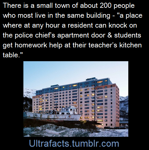 Whittier, Alaska, is a town of about 200 people, almost all of whom live in a 14-story former Army barracks built in 1956. The building, called Begich Towers, holds a police station, a health clinic, a church, and a laundromat. Its hallways resemble those of a school . One can often find residents shuffling around in slippers and pajamas.
